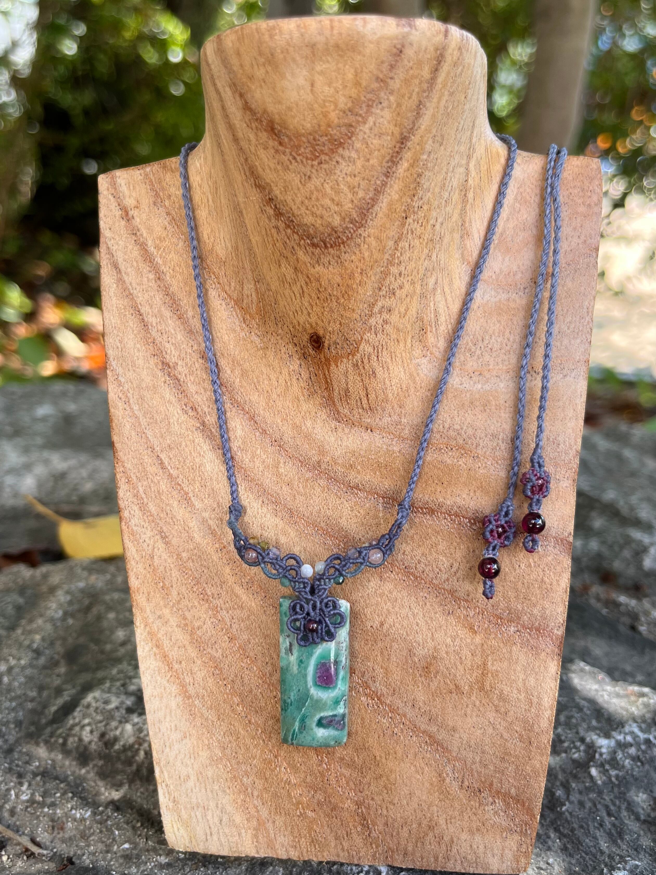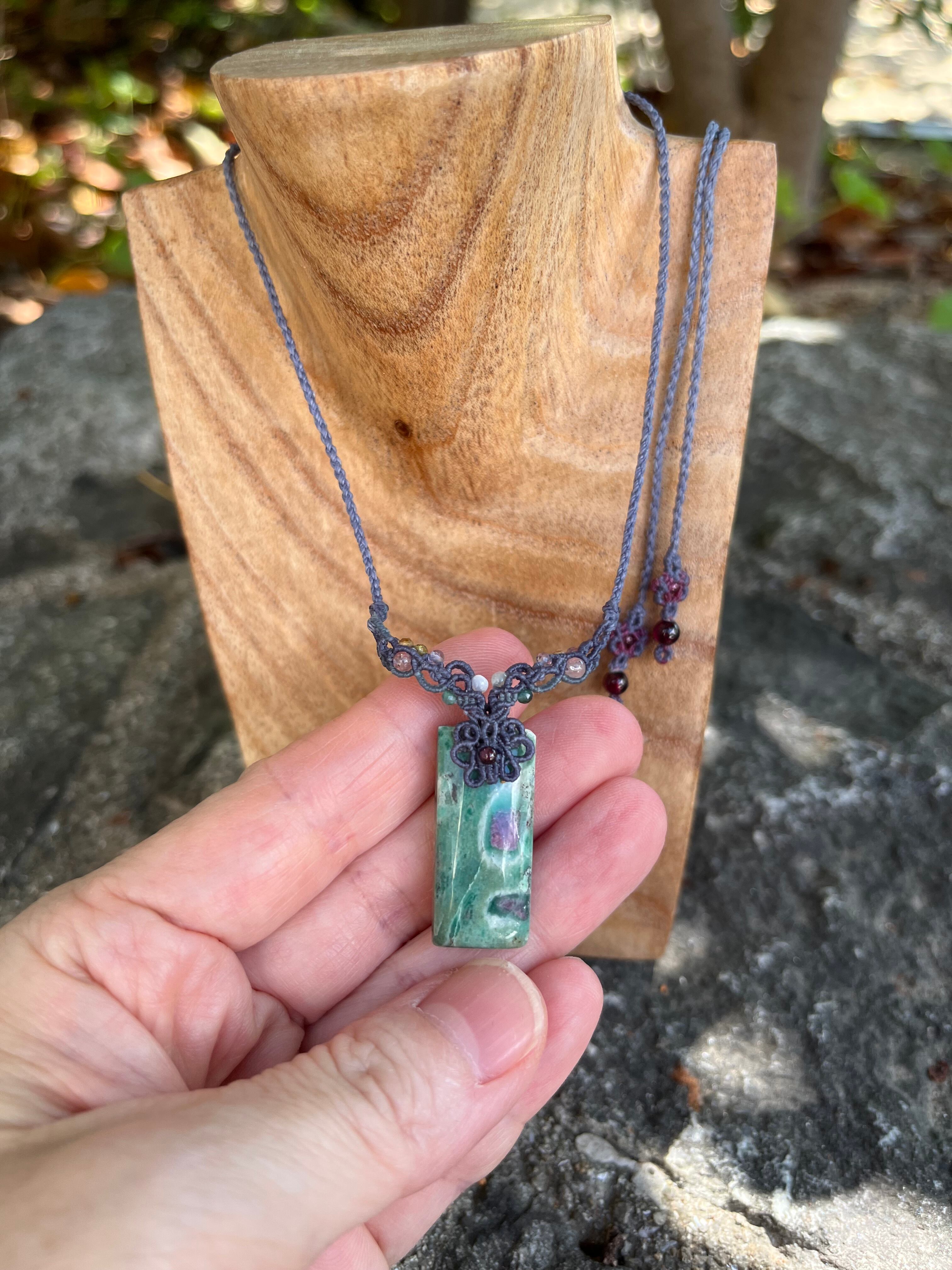 深みのあるグリーンにルビーの赤が浮かび上がる、ルビーインフックサイトのマクラメネックレスです。