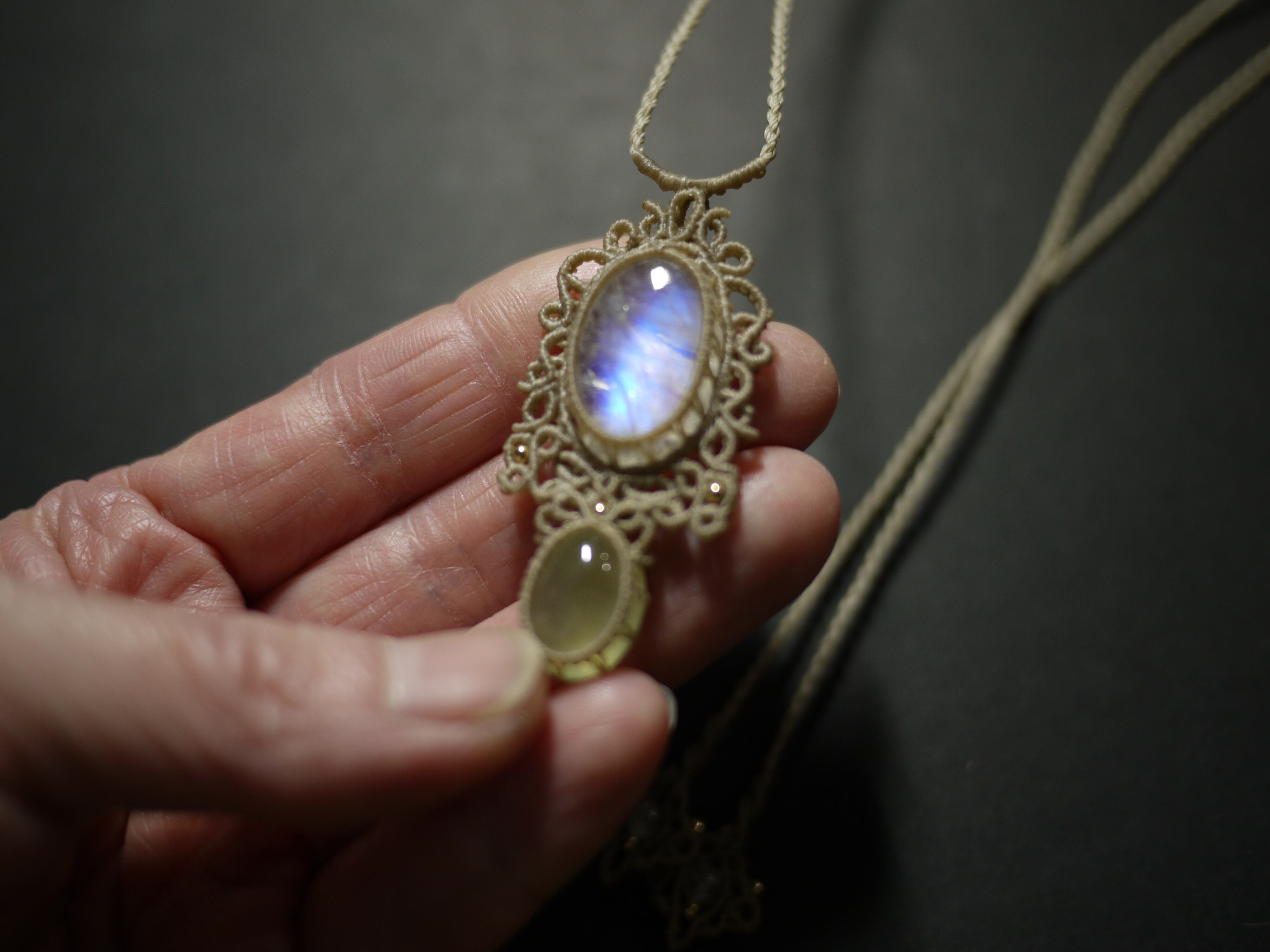 幻想的なブルーのシラーが美しいレインボームーンストーンと、やさしい透明感のあるグリーンが魅力のプレナイトを合わせた、上品な天然石マクラメネックレスです。